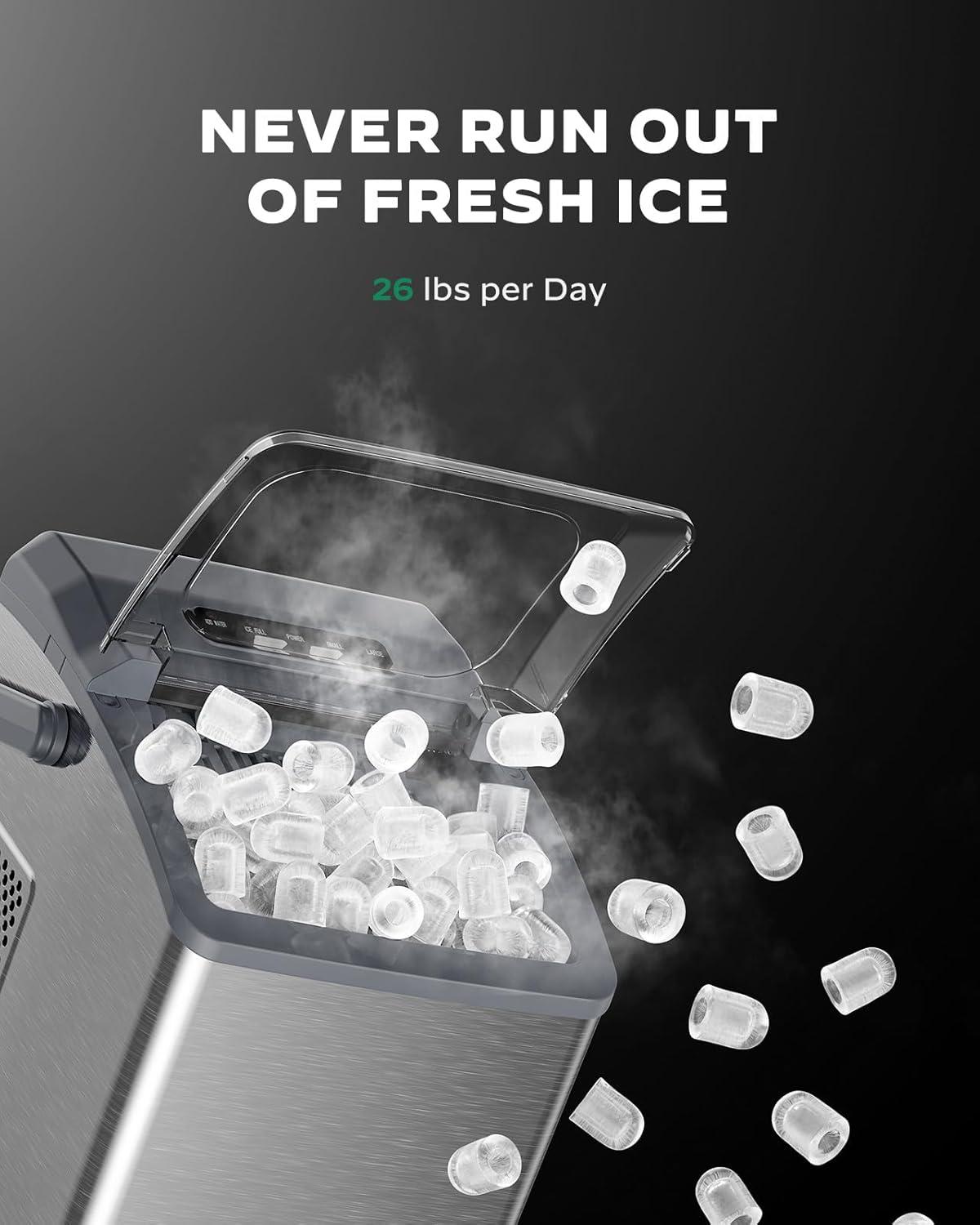 Large 26 lbs Daily Output: Hosting a crowd? Keeping up with ice demand is no problem thanks to 26 lbs per day output offered by our ice maker. Perfect for family gatherings, this countertop ice maker is built to deliver consistent ice without skipping a beat.